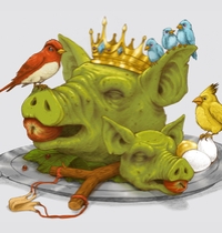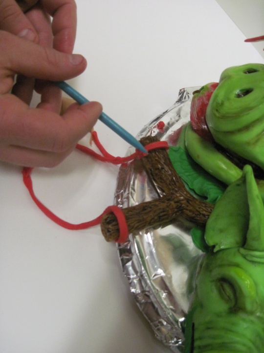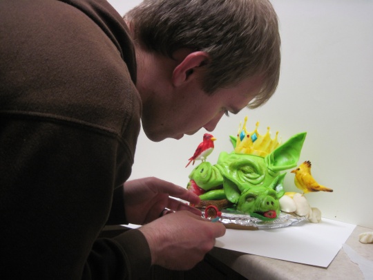 Since my husband and I are addicted to Angry Birds the game, this was naturally our first choice of design for the competition. We baked the cakes, froze them, carved the basic shape of both pig heads, and crumb coated them. We decided to try white chocolate modeling dough for the first time instead of fondant since we are not fondant fans. So we sculpted the more intricate details in plain modeling chocolate before we rolled out the colored modeling chocolate for the final layer. We then sculpted the eggs, birds, slingshot, crown, and ears out of more modeling chocolate. We then painted more color details on the pieces using food coloring thinned with vodka. We used toothpicks to help the birds stand on the pigs in order to finish the composition.