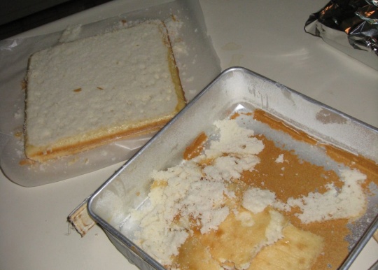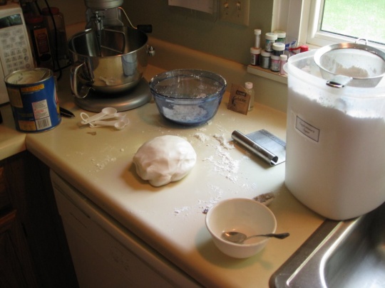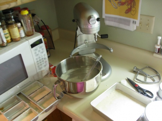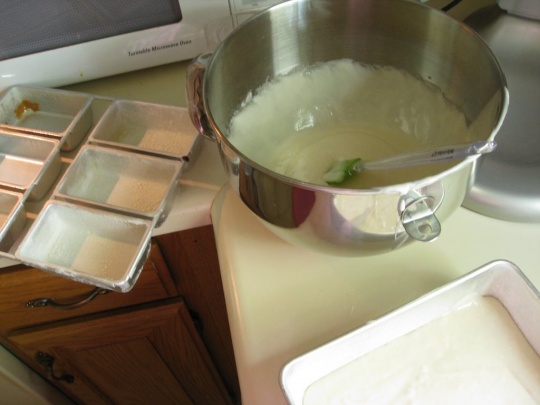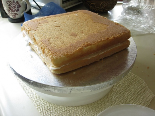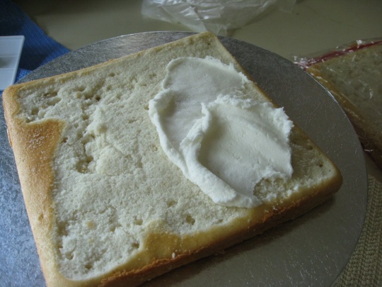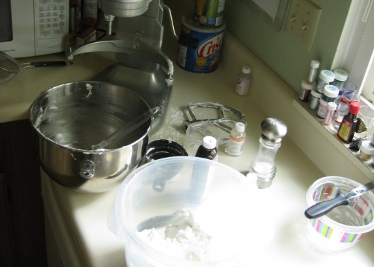 To simplify things, I baked the cakes using a vanilla cake mix out of a box and made two 8" square pans and a few loaves out of my mini loaf pan. Baked them and while they were cooling, I made the buttercream icing, fondant, royal icing and simple syrup. It was quite a messy day in the kitchen!