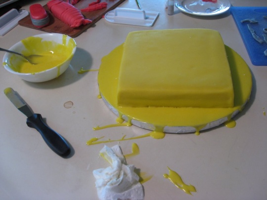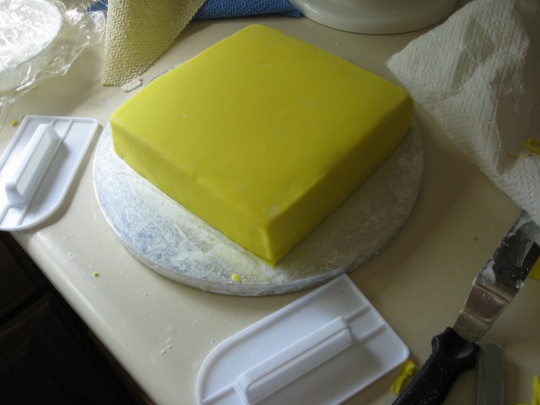 Later when the cakes were cool, I leveled the 8” square cakes, slathered on the buttercream in the middle, added the crumb coat and gently rolled on the yellow fondant on the cake and smoothed it all down.