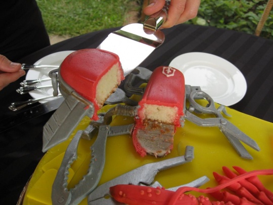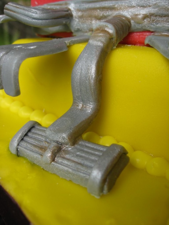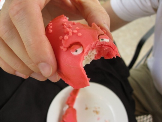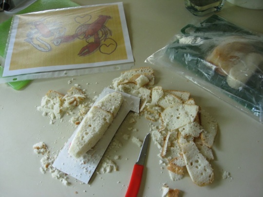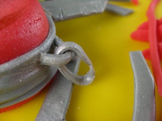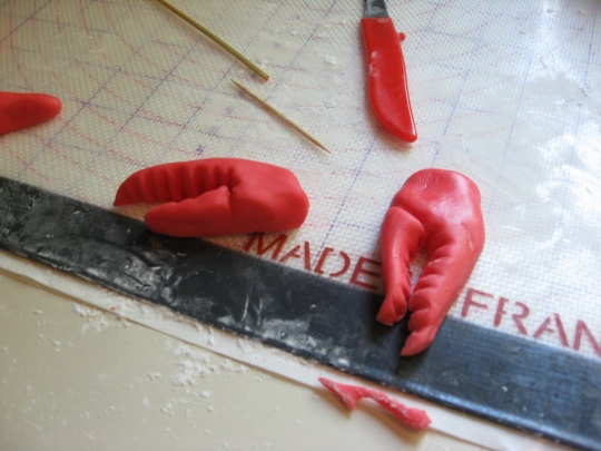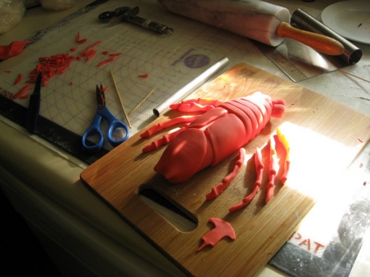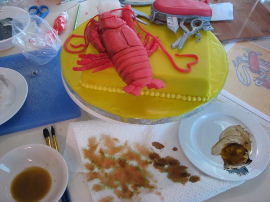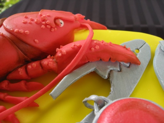 Putting it all together was time consuming. Each piece of the knife needed to be supported while the parts dried on with royal icing. The crayfish was also "glued" together with royal icing. While assembling the crayfish, I broke the tiny nose off at least five times which was very frustrating! Finally, after I got everything "glued" on it just didn't feel finished.