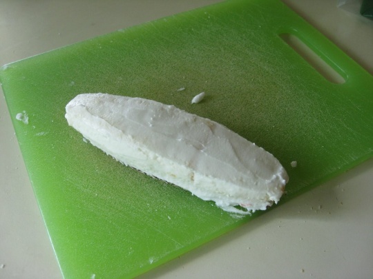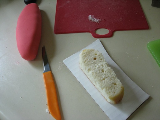 The best part of cake making is sculpting! I carved the tiny loaves of cake into oval shapes, one a little smaller than the other, and then cut out a little cardboard shape for them to sit on. I covered them in buttercream, and then smoothed on the fondant.