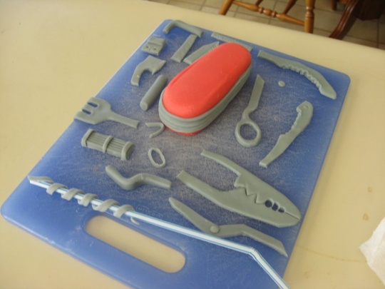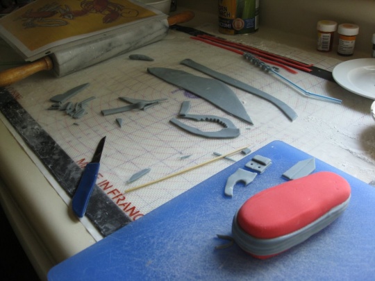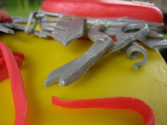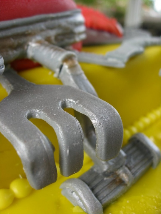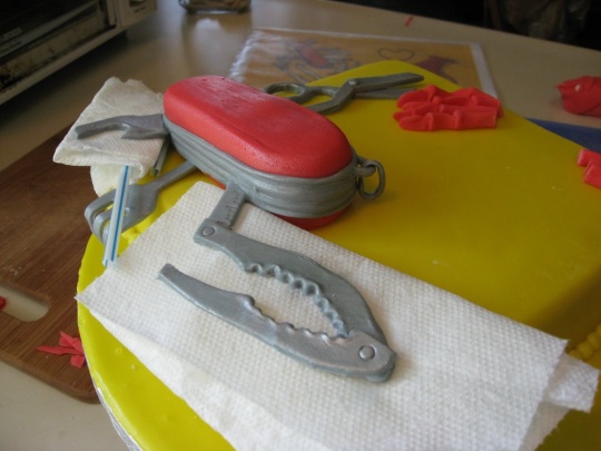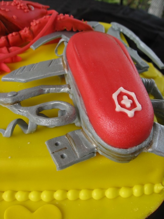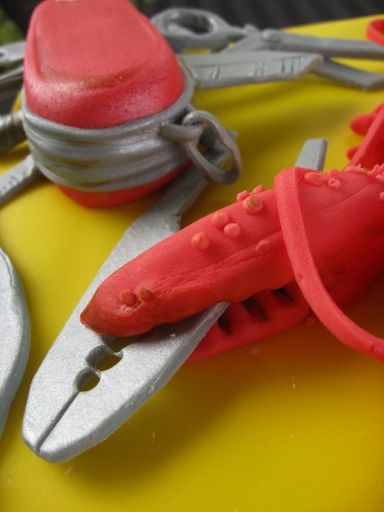 Next, I rolled out the gray fondant and cut out shapes for all the tools on the knife, let them dry, and painted them with edible silver paint. While that was drying, I added pieces of fondant to the crayfish body to give it more dimension. I sculpted the legs and claws and even cut out tiny eyes with fondant and let it all dry.