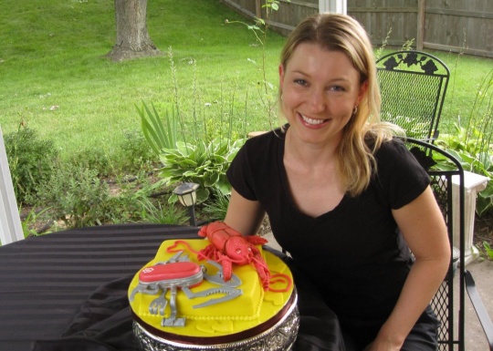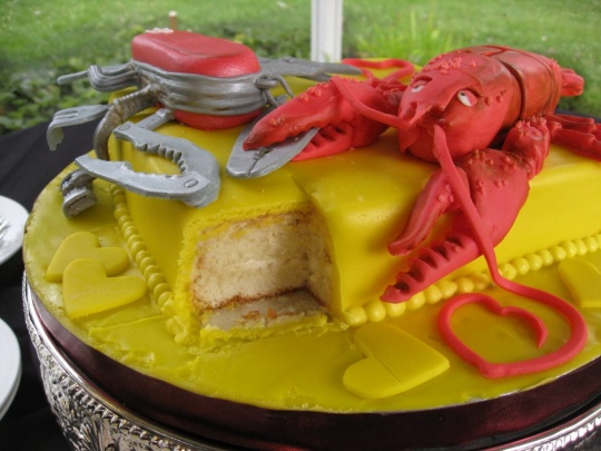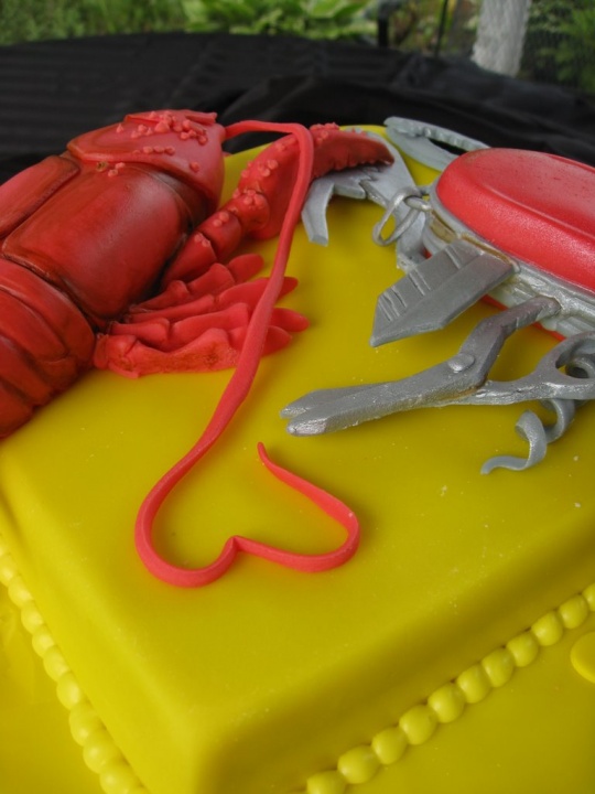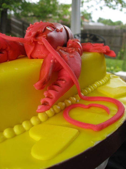 To add more detail, I piped on bumps on the crayfish with royal icing and painted him with brown food coloring to give him a more realistic look. The antennae came last. I draped the fondant antennae on him and down the side of the cake. Added a ribbon to the board and added a few more yellow fondant hearts on the base and voila! Four days later, finally it was finished!