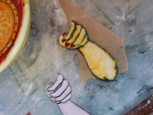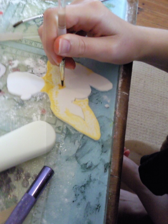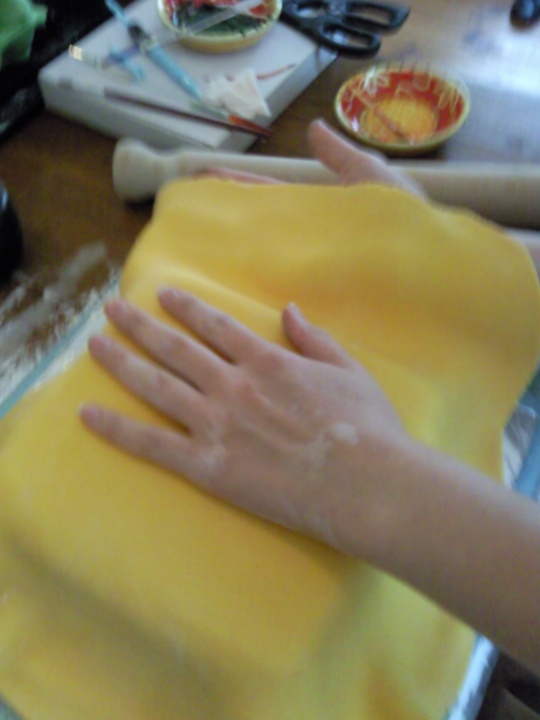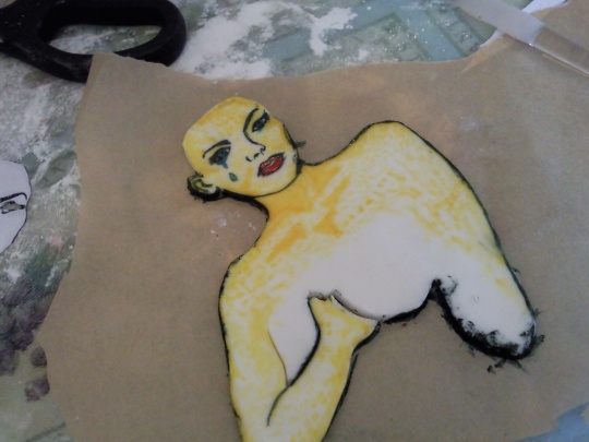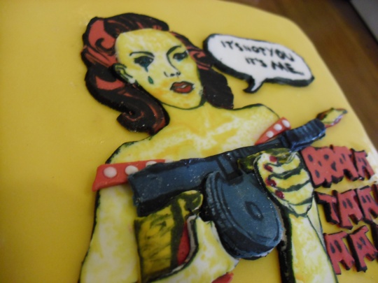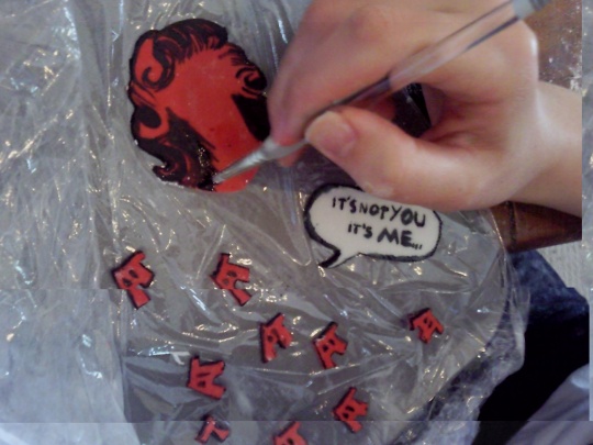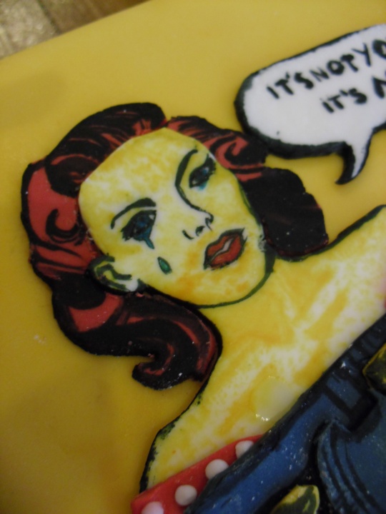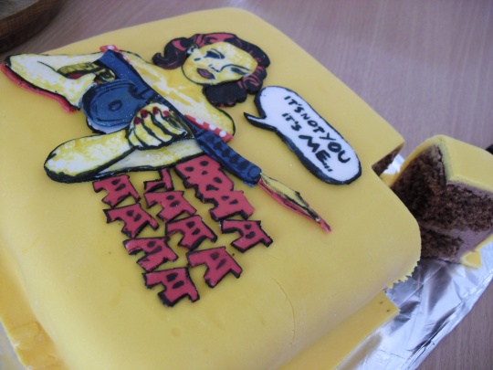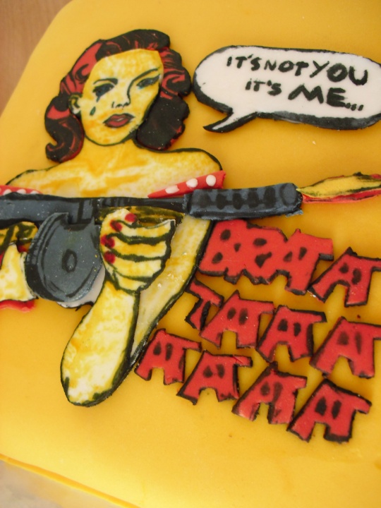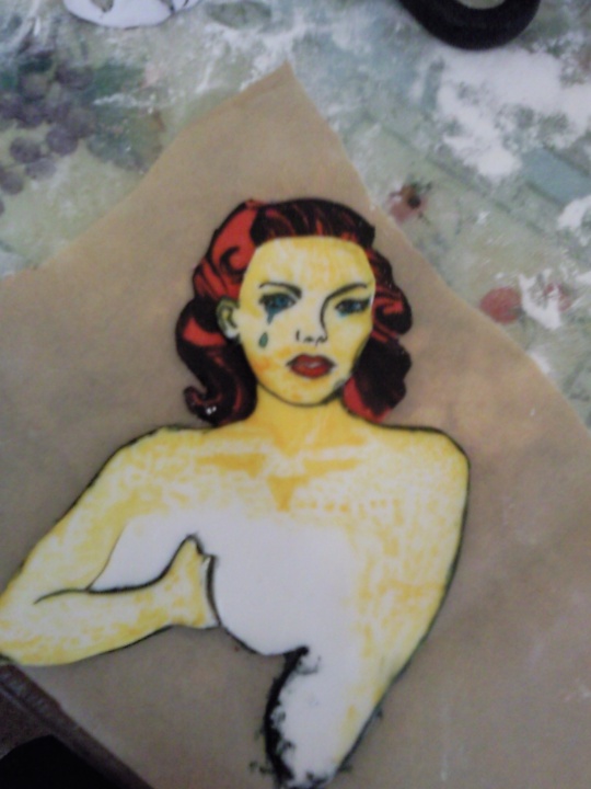 For the decoration, I used shop bought roll out icing and used gel food colours to colour it. I've done a fair few cakes using this method, rolling out icing and cutting the shapes that make up the image using a craft knife. Then I mix the food colouring with water and use a brush to paint the details and the outlines (very good technique for anime and cartoon characters). I cut out the decoration while the cake was cooking and cooling. After covering the cake with butter cream and then covering with orange icing I brushed a little water on the surface of the cake so that the pieces I put on top would stick to it. Hell of a scary experience trying to relocate the woman from the tray I constructed her on to the top of the cake!!! Luckily all went well and she went on ok.
